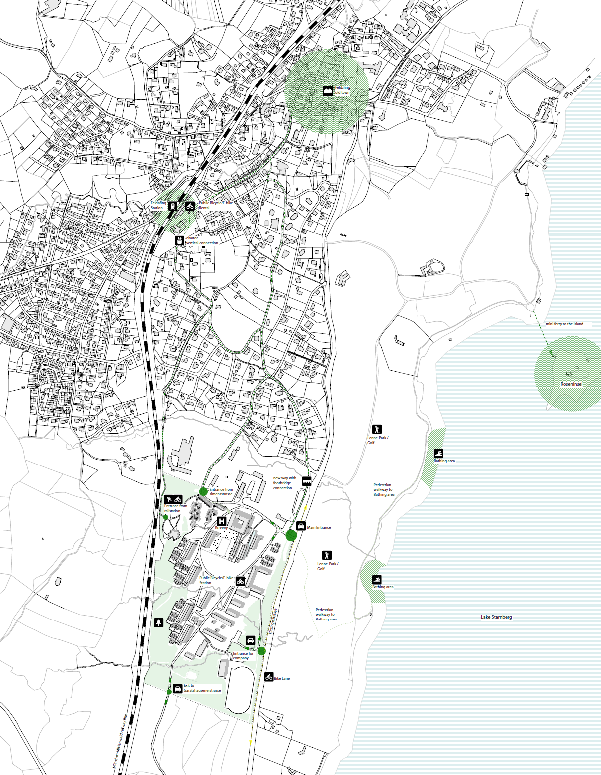 The village of Feldafing occupies an idyllic location next to Starnberg Lake. It boasts natural attractions that include Lenné Park, the lakeside and Rose Island in the east, and striking un-dulating landscape to the west. But the current urban structure of Feldafing has both design and functional deficiencies that need to be countered with targeted re-development and zoning concepts. The relocation of the signal corps training centre
