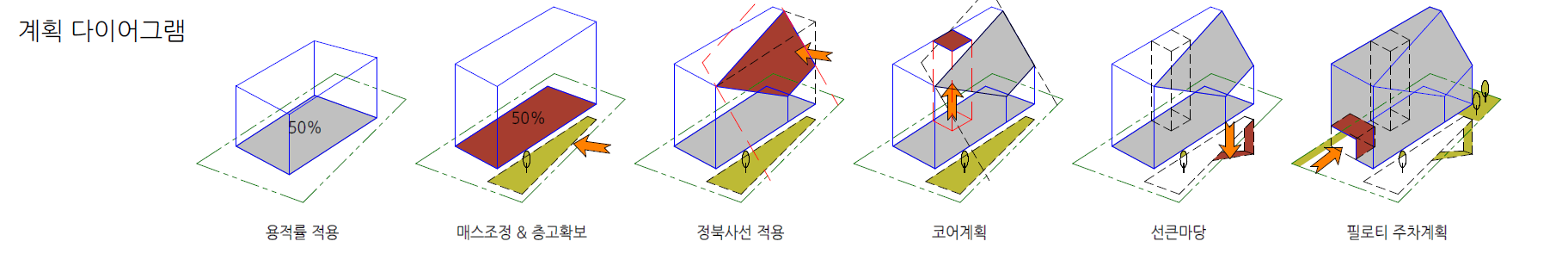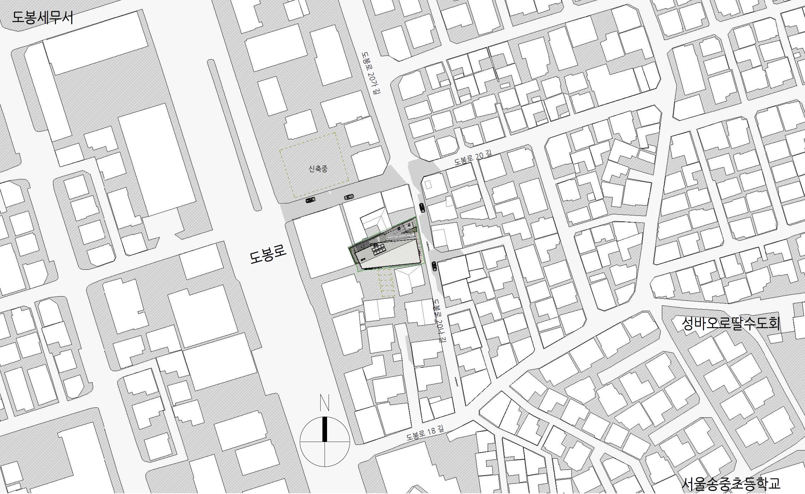 2. Improving Visibility The surrounding buildings vary in height and feature complex forms with irregular masses. Buildings along the main road, Dobong-ro, are over six stories tall, making it difficult to recognize the site located in the alleyway. This project simplifies the building’s mass and increases its height to enhance visibility. A unique façade design will further establish the building’s identity.
