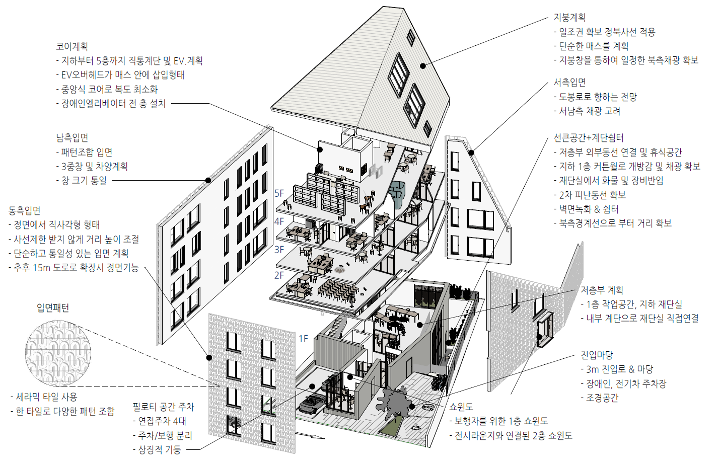 1. Ensuring Public Accessibility The building is designed to naturally connect the interior and exterior through a narrow alleyway. A courtyard that expands from the alleyway leads seamlessly into a sunken garden. The open space at the front of the building allows for various events to take place.