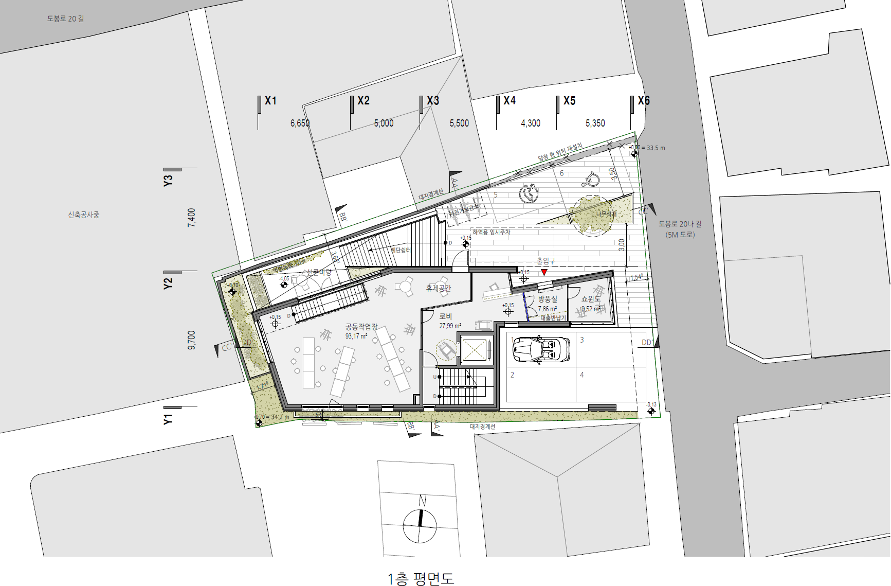 Public Office Facility, Site Area: 485.3 ㎡, GFA: 1,298 ㎡, BCR: 48.56%, FAR: 205.24%