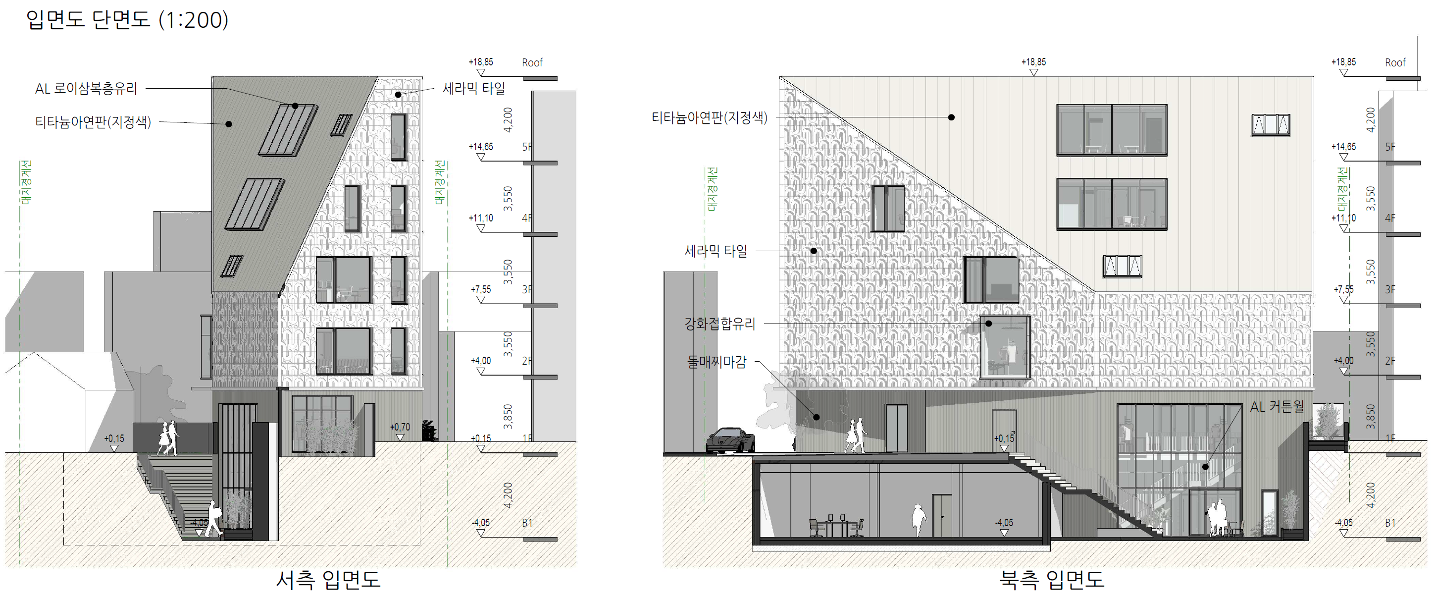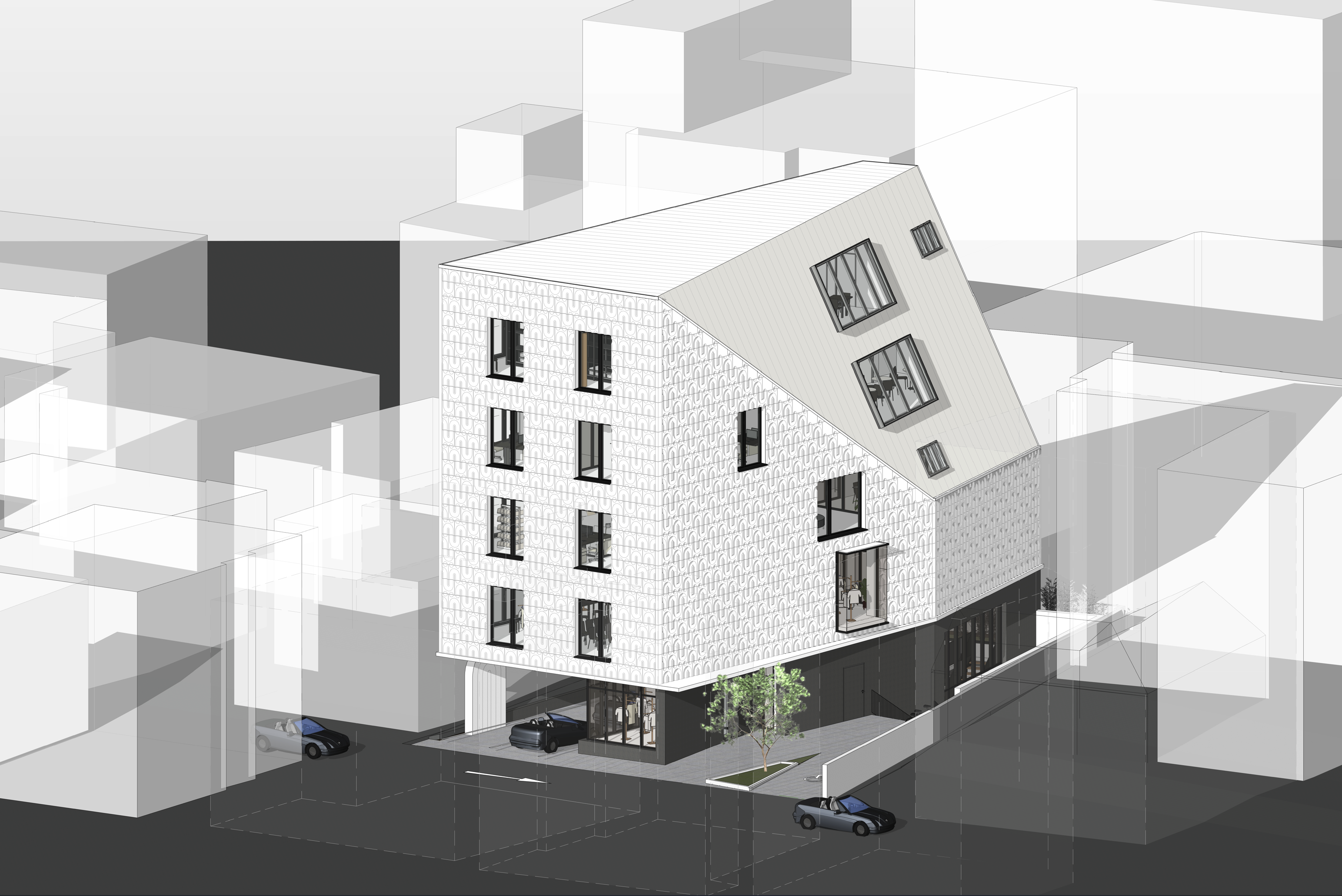 3. Expressing the Functional Space Program The façade is designed to intuitively showcase the fashion-related programs to the exterior. The ground floor features a display window for pedestrians, while the second floor includes exhibition spaces that function as large display windows visible from a distance. The distinctive pattern and refined surface of the exterior wall symbolize the method of weaving textiles, aligning with the building's theme.